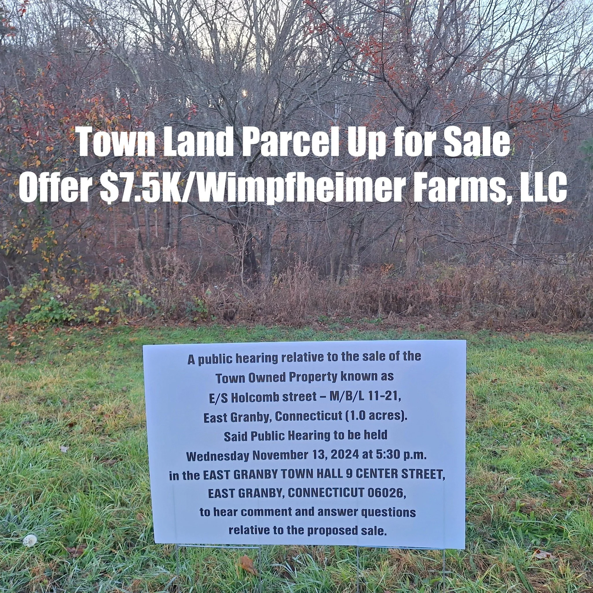 E/S Holcomb Street, 1 Acre, purchase offer of $7.5K/Wimpfheimer Farms LCC (Land was found to be a 2 acre lot and offer withdrawn prior to Town Meeting Notice)